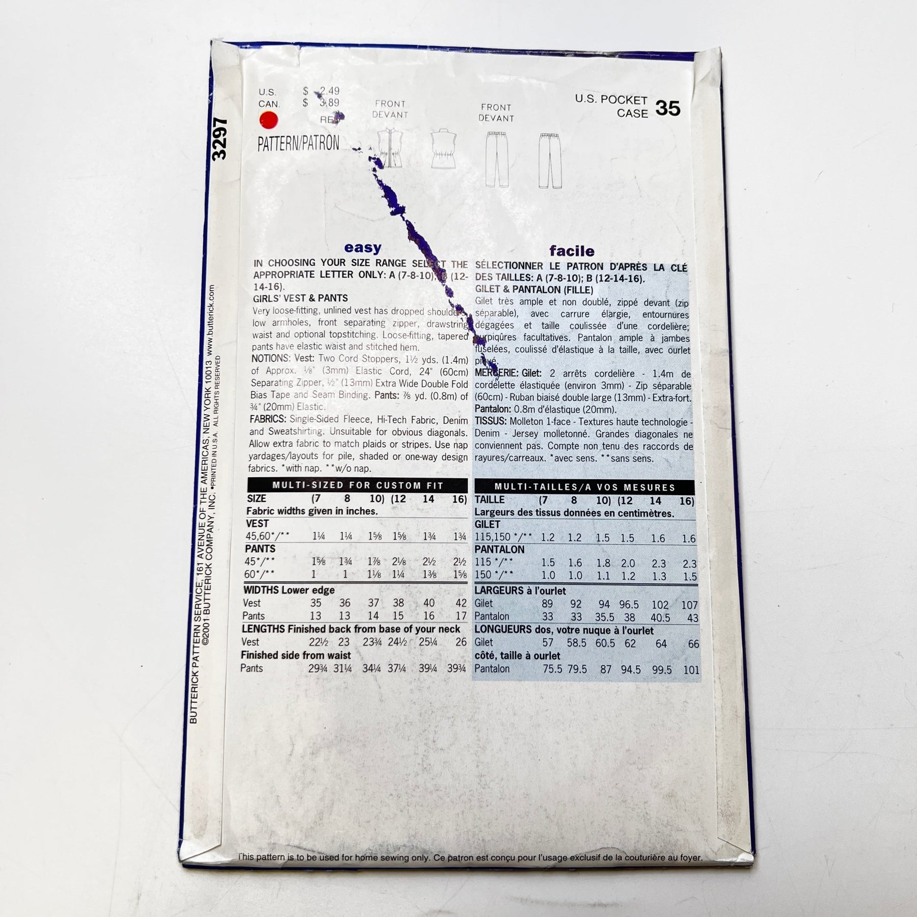 • Please note your size and measurements, as well as the required notions on the package.