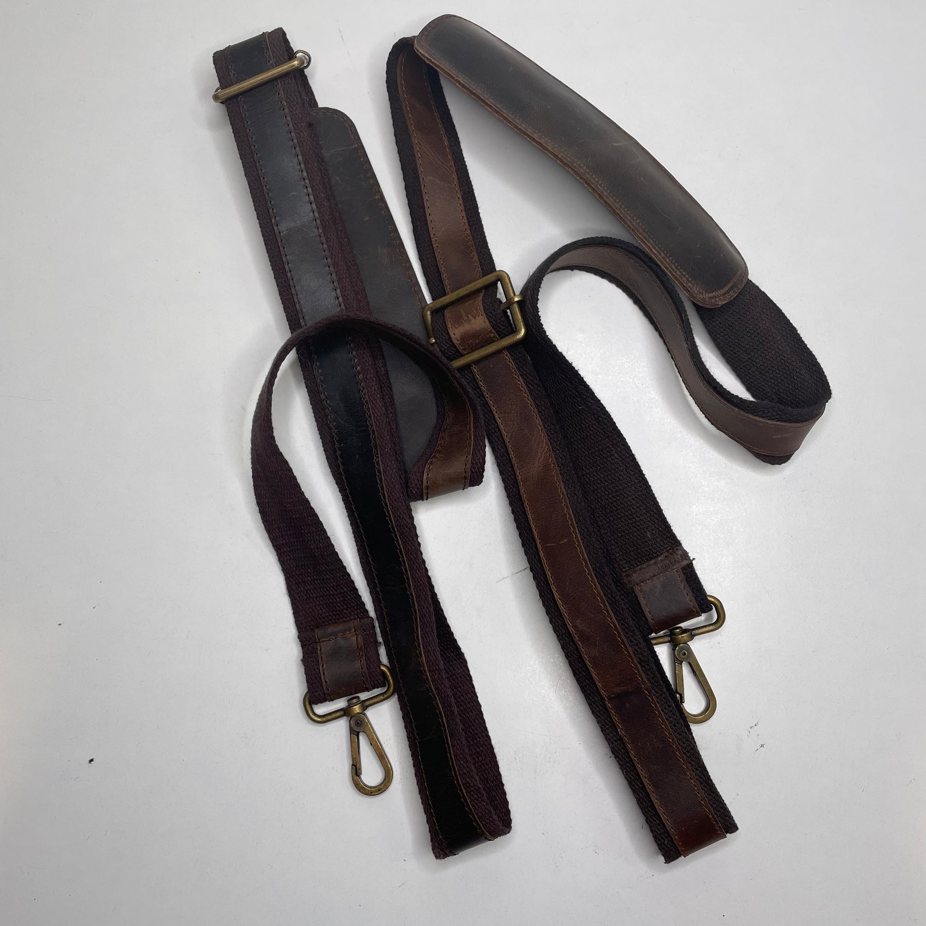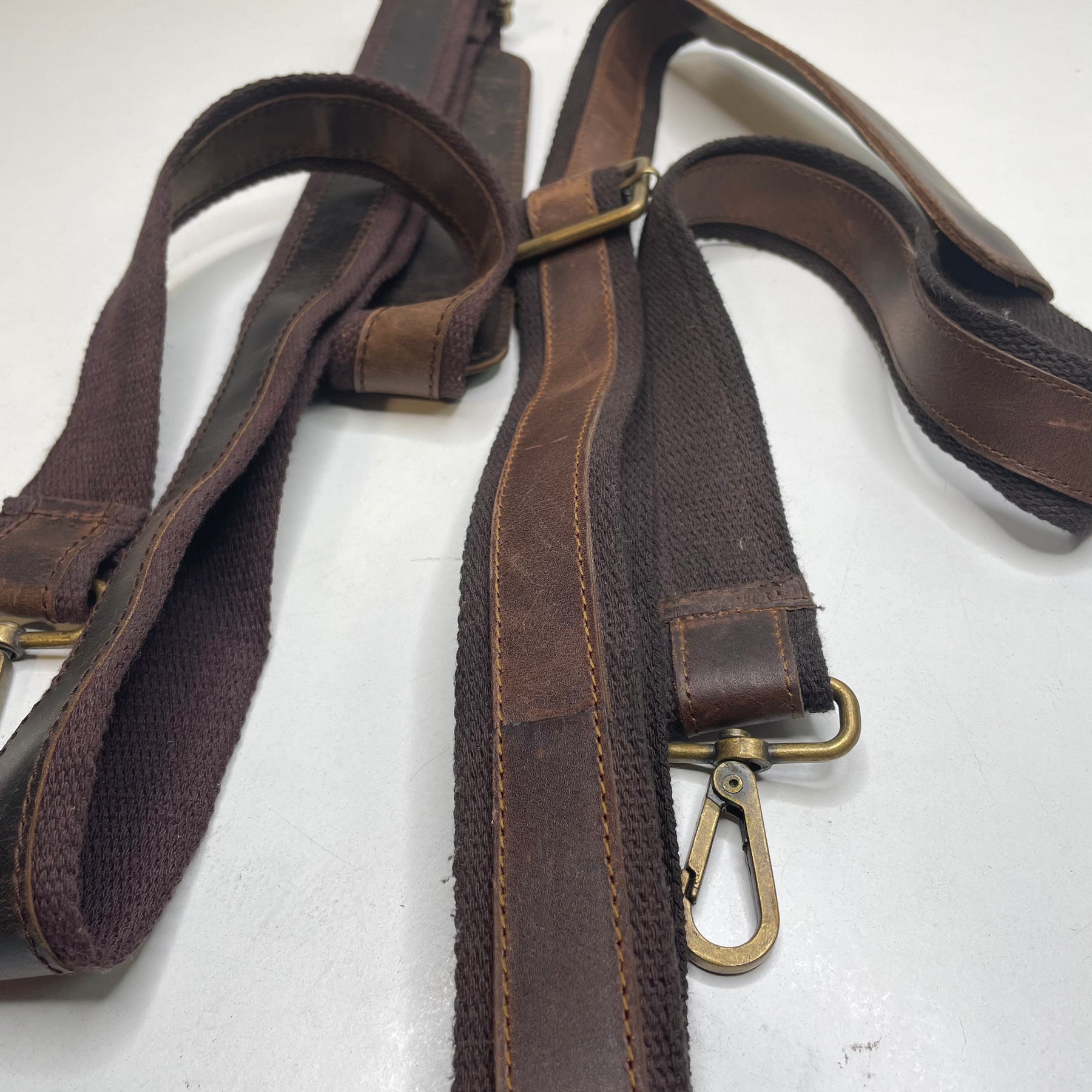 - Cotton webbing strap with leather accents and brass hardware