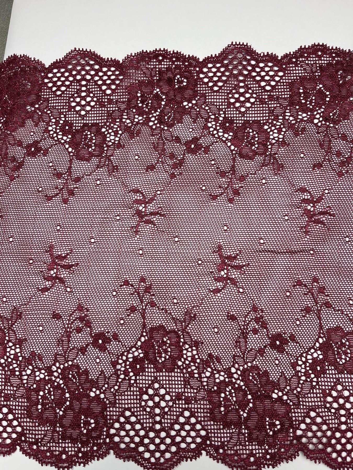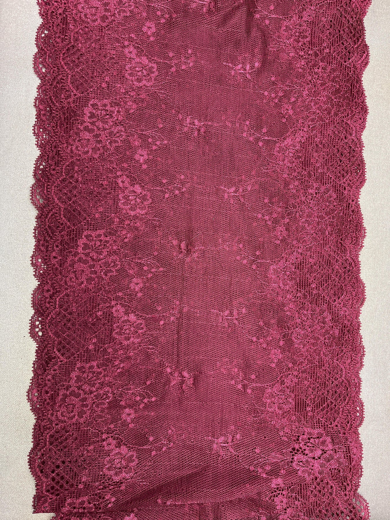 Fabric Details:Content: Polyester, Nylon (blend)Structure: Knit, Stretch laceWidth: 23 cmLength: 3.2 mWeight: 10 oz/yd²Stretch: 2-way stretch (approx. 20% in one direction)Suggested uses: Lingerie, sleepwear, embellishmentNotes: Rich burgundy/maroon galoon lace.S