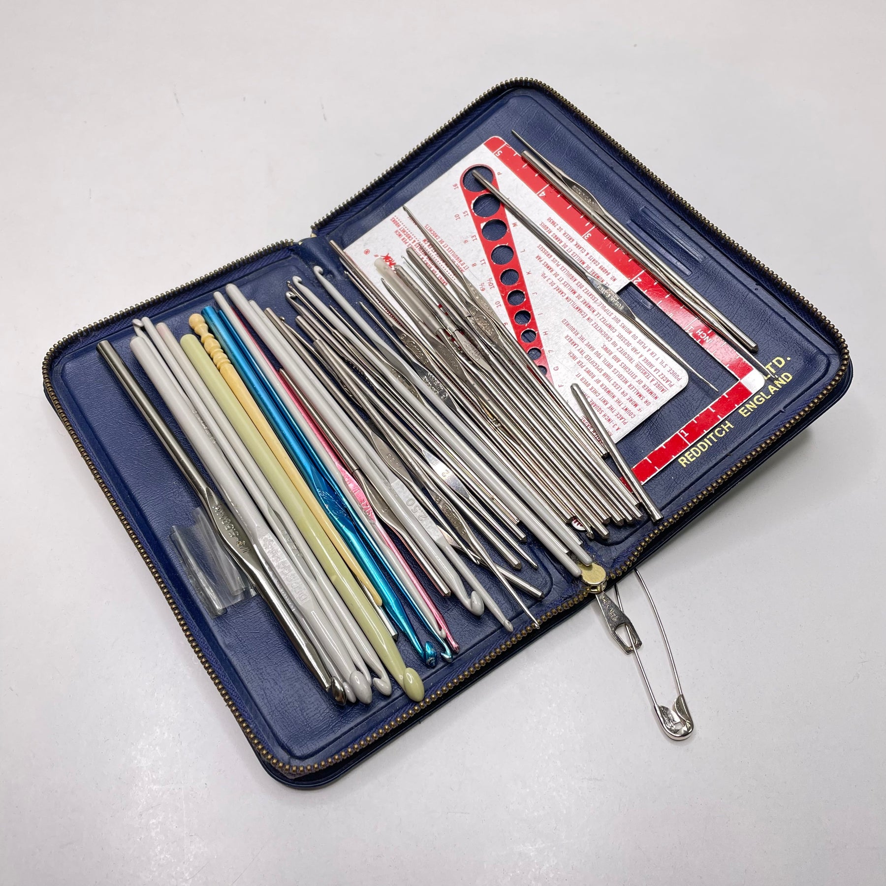 - Lots of multi size hooks. Knitting needle size gauge, in a vintage case