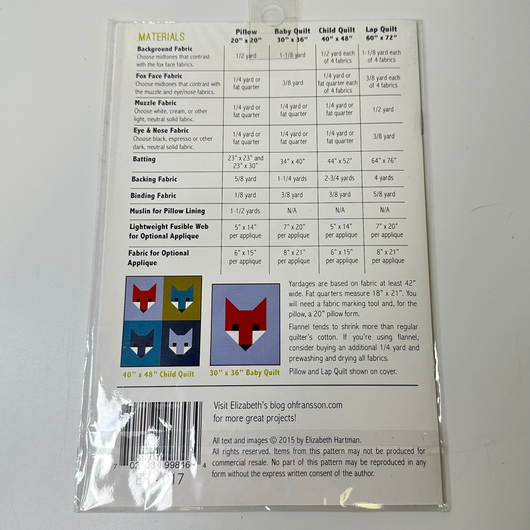 Sewing Pattern - Craft - Elizabeth Hartman EH017