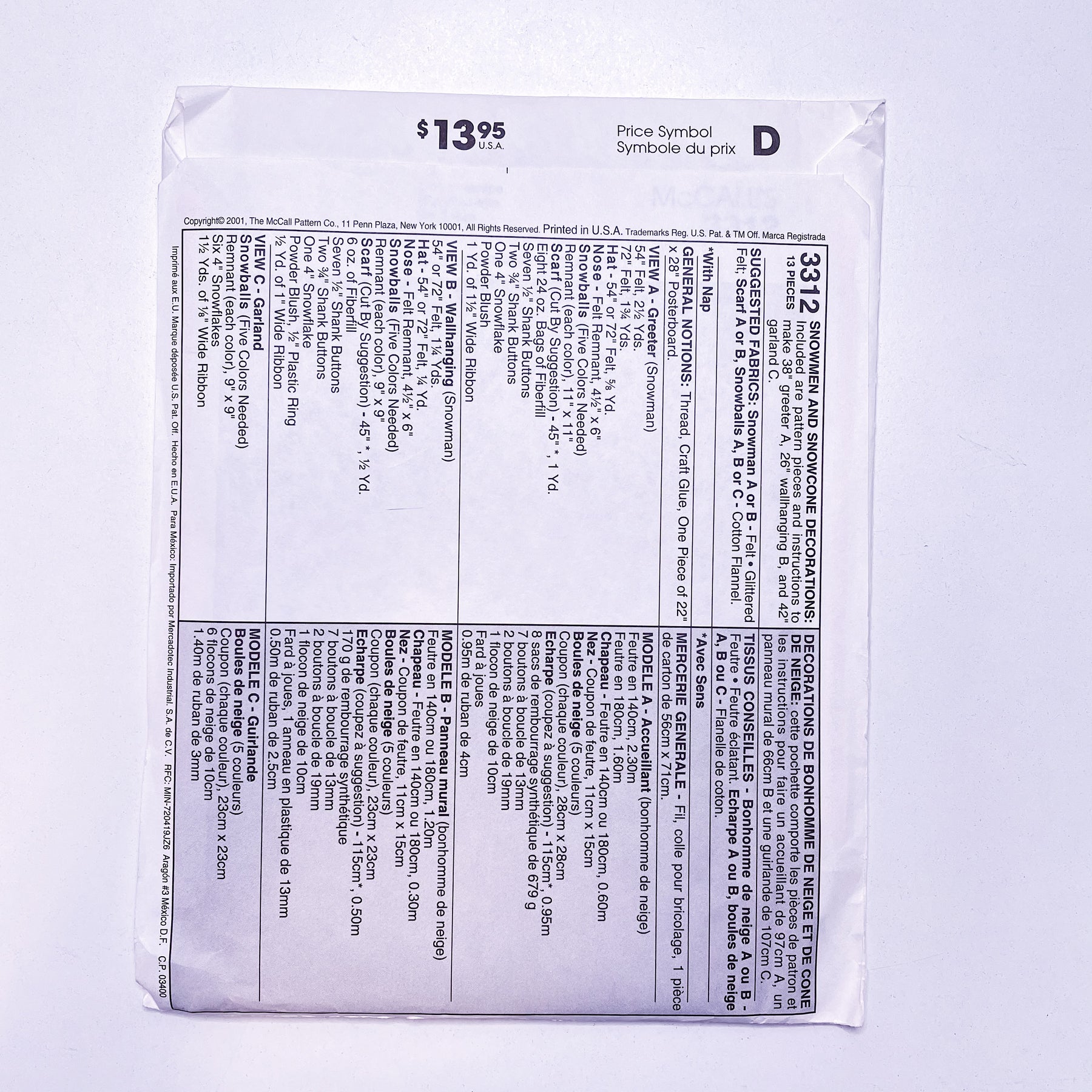 Sewing Pattern - Craft - McCall's 3312