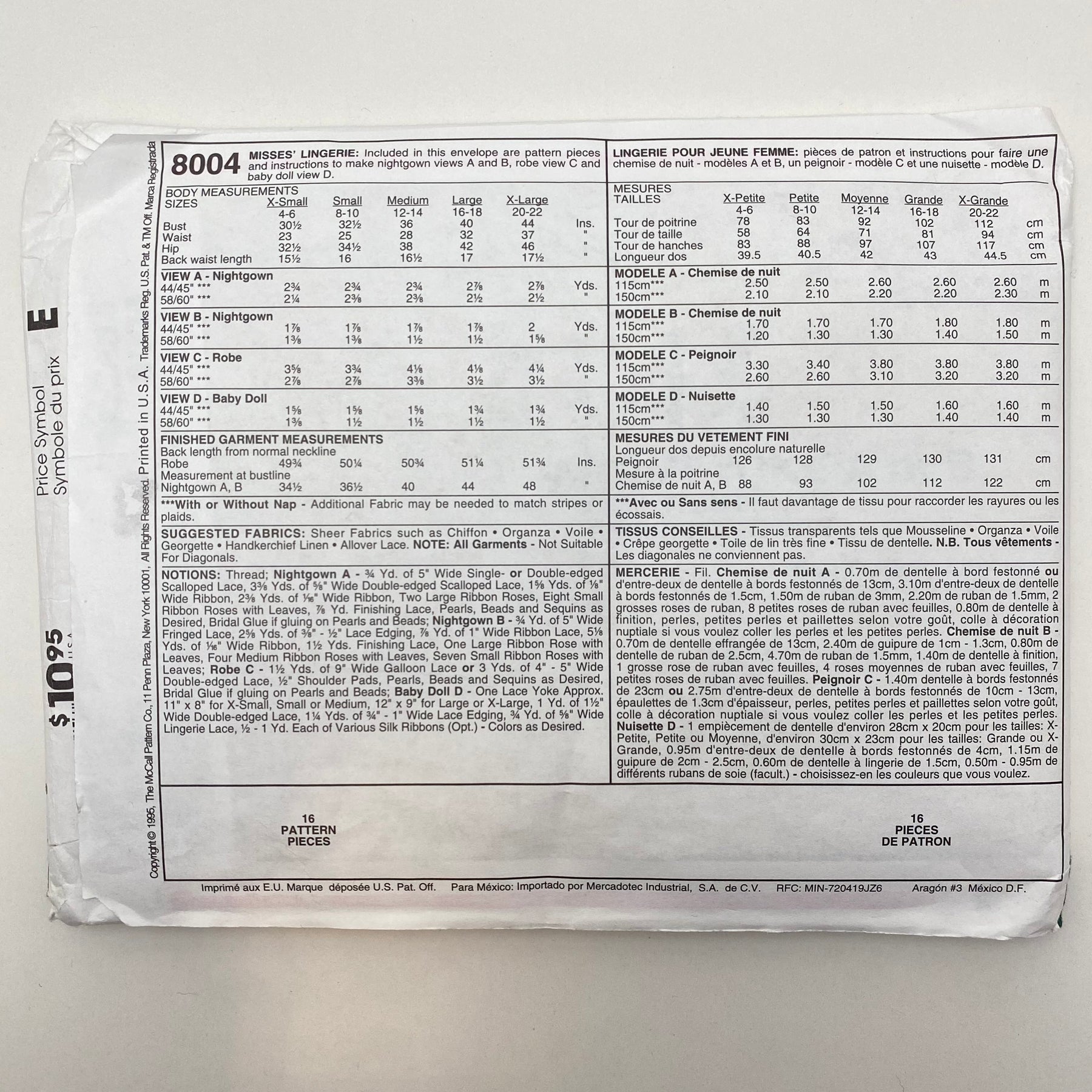 Please note your size and measurements, as well as the required notions on the package.Â