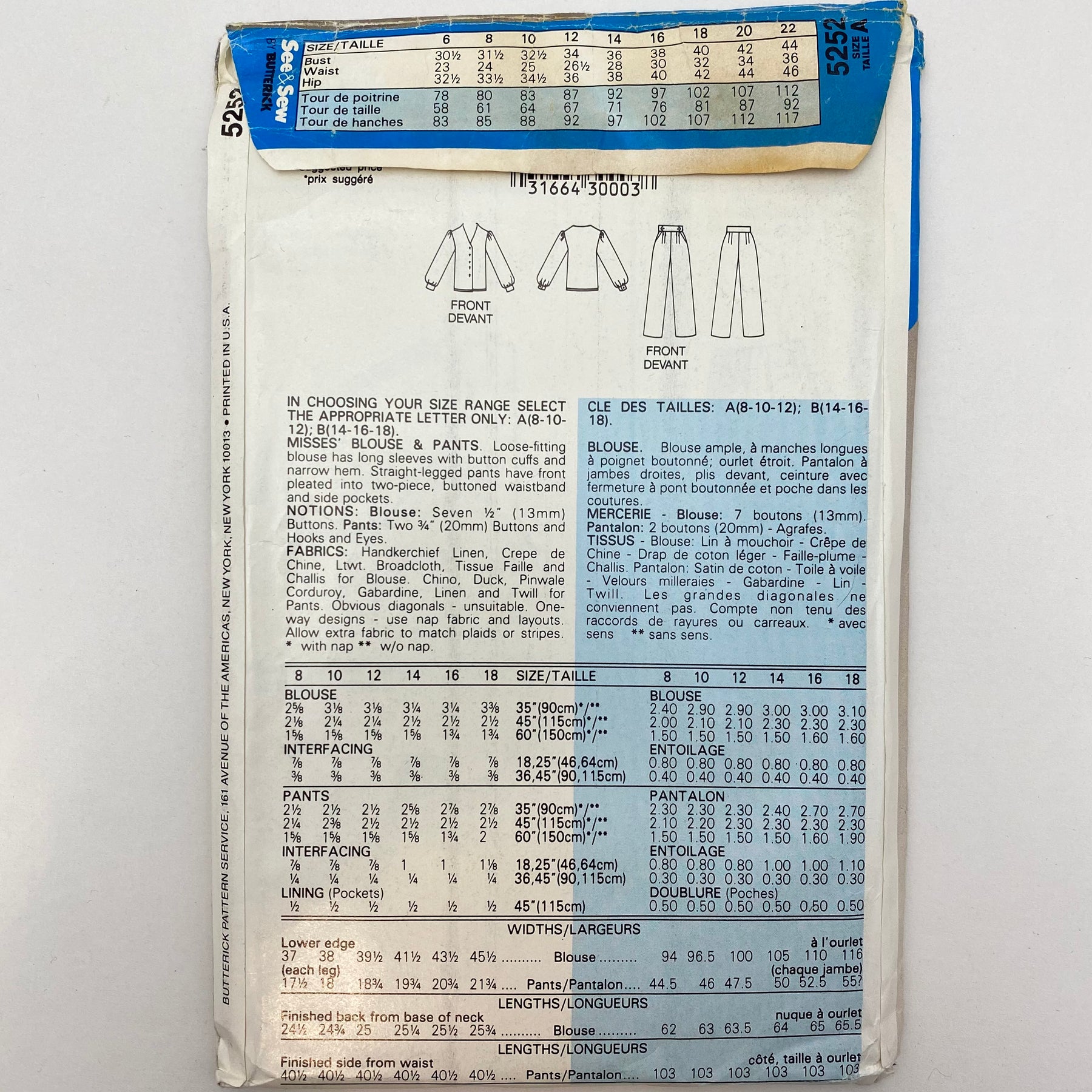 Please note your size and measurements, as well as the required notions on the package.Â