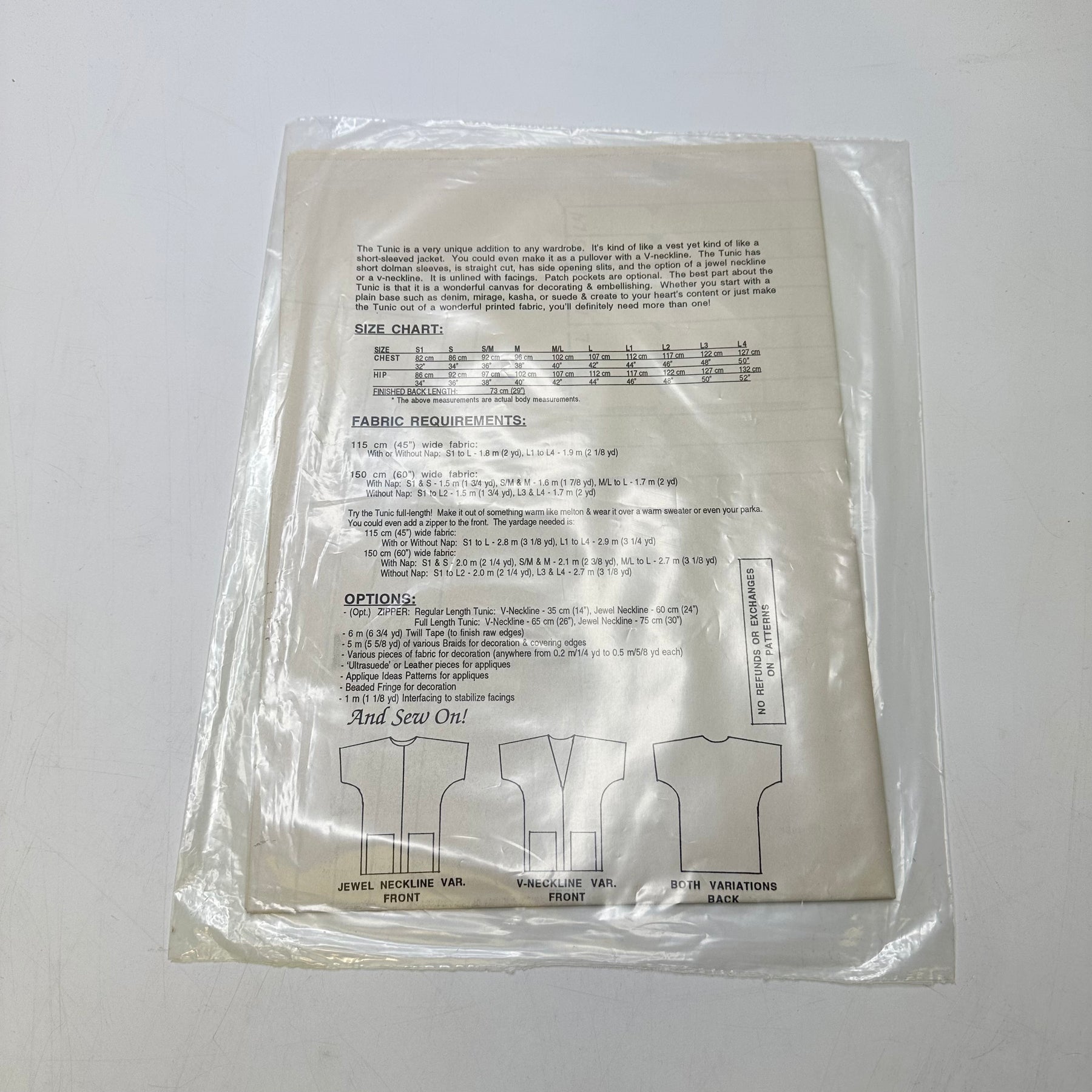 • Please note your size and measurements, as well as the required notions on the package.