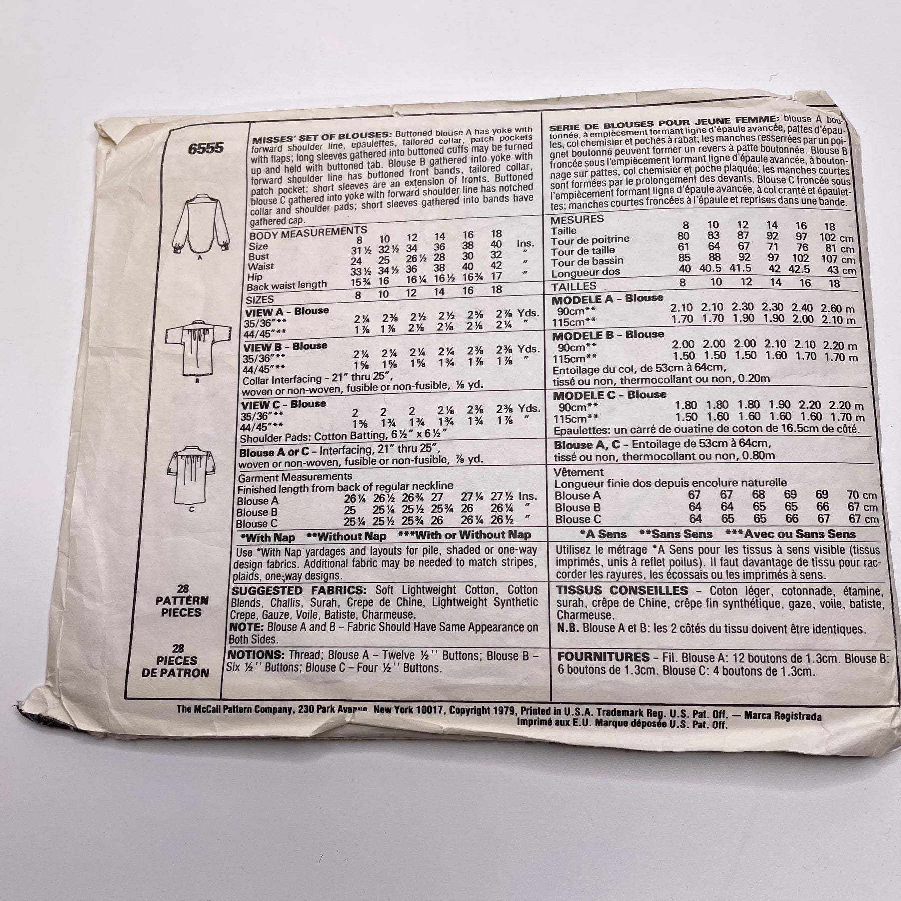 • Please note your size and measurements, as well as the required notions on the package.