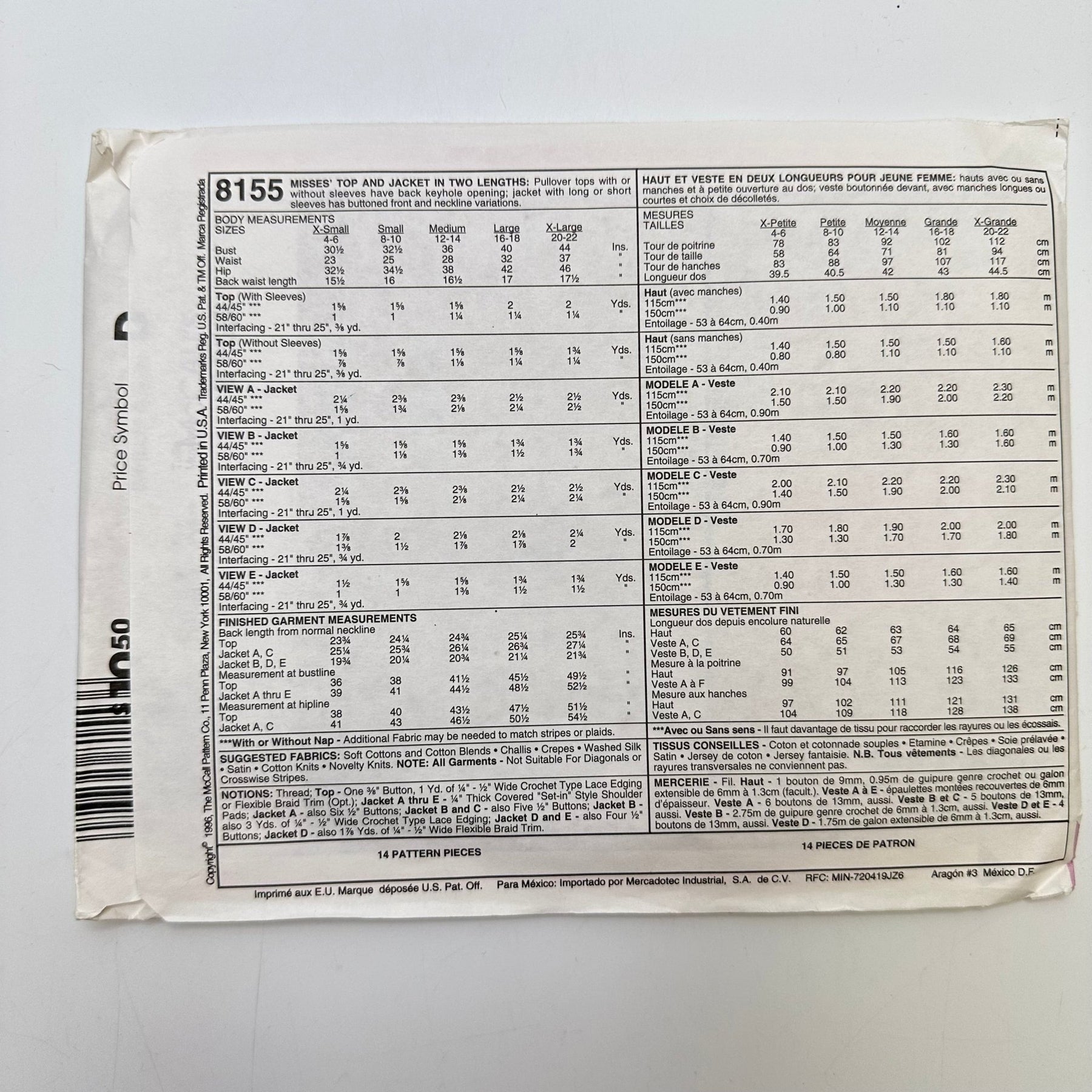 • Please note your size and measurements, as well as the required notions on the package.