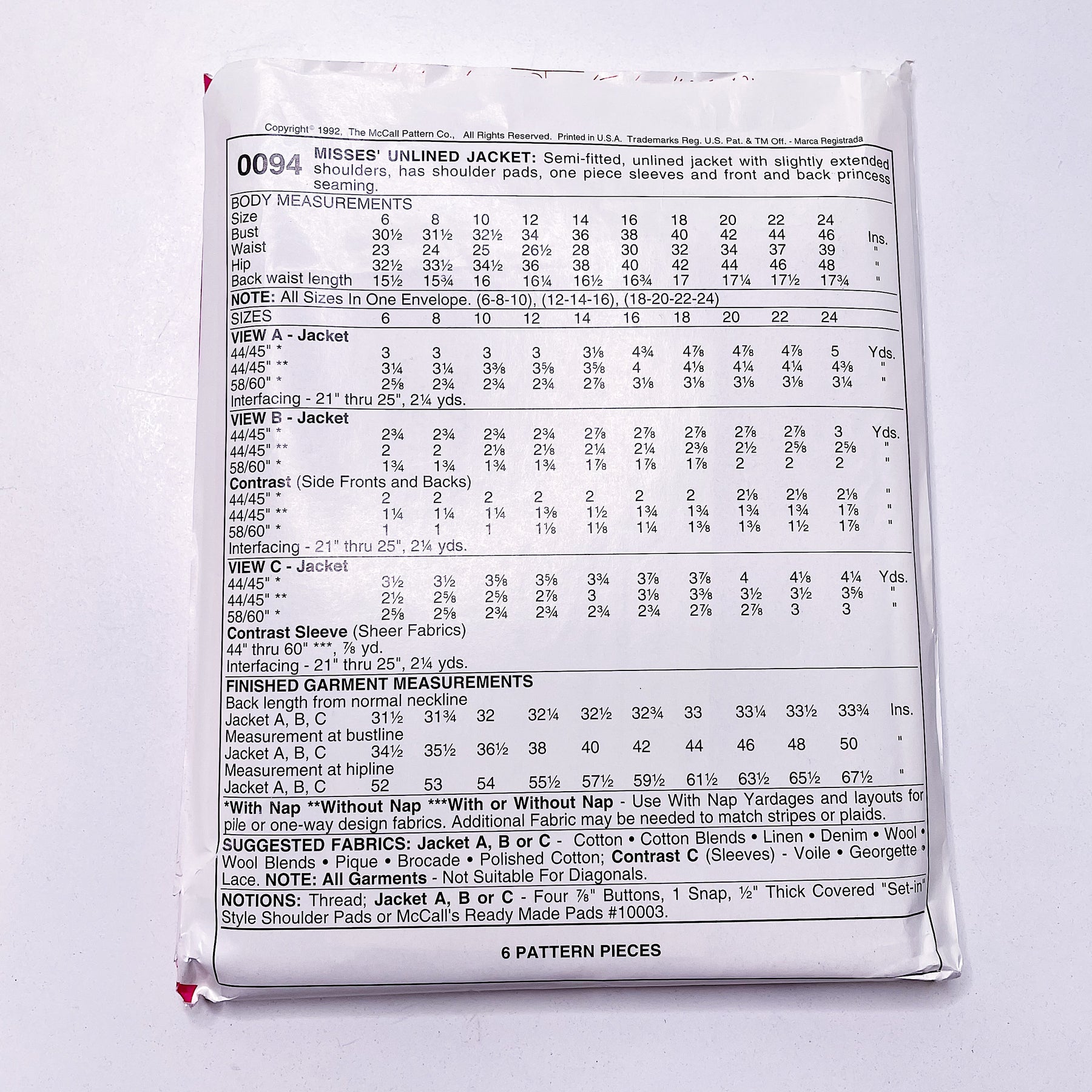 - Please note your size and measurements, as well as the required notions on the package.